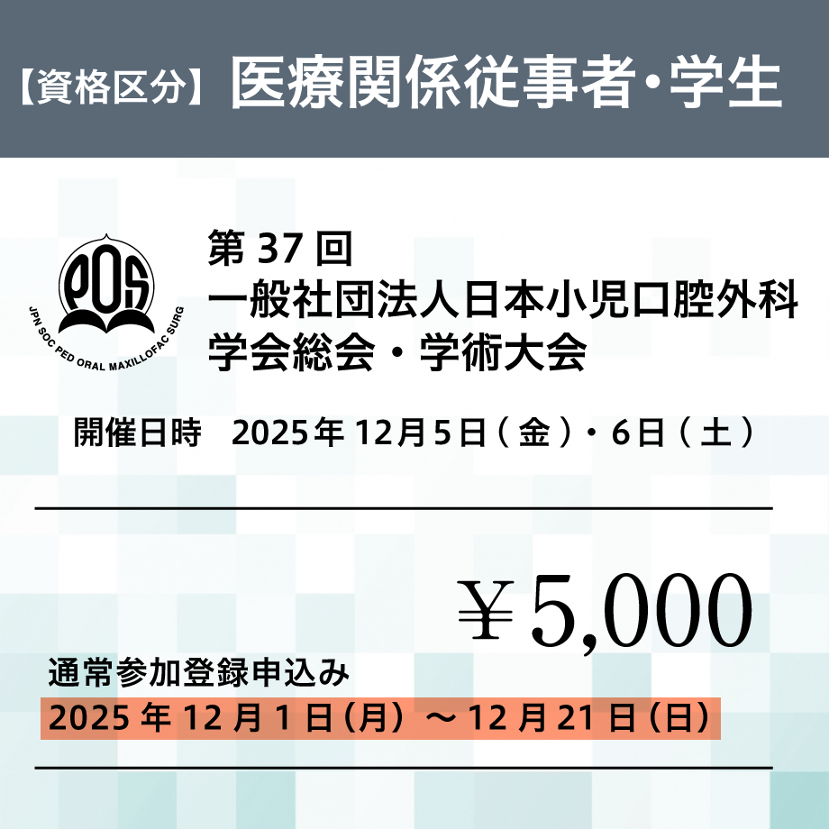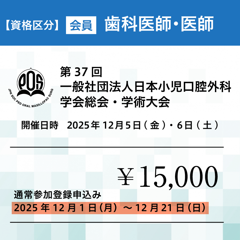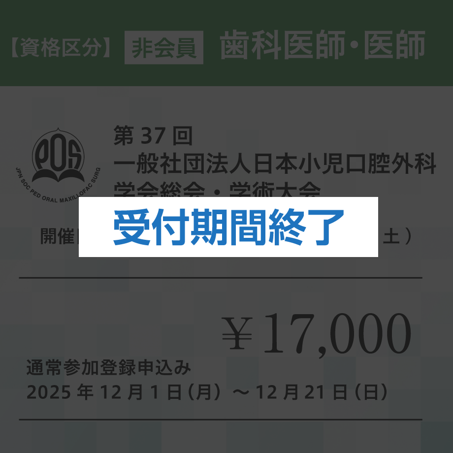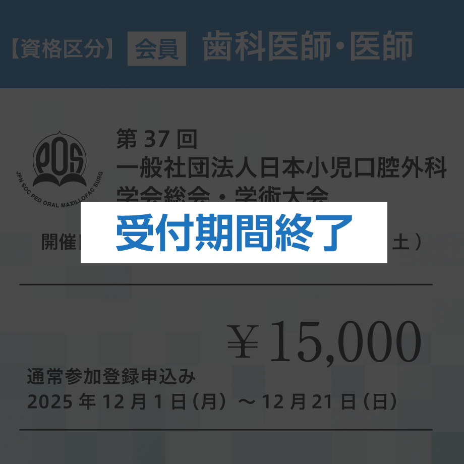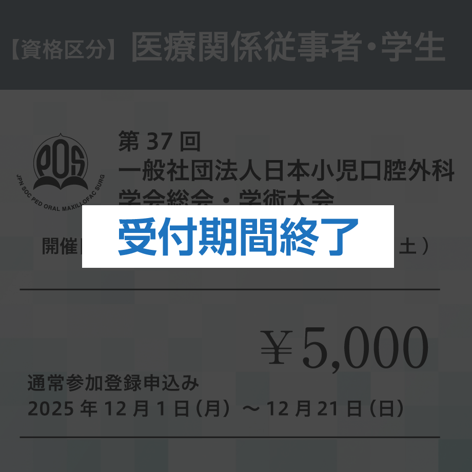 開催概要 テ ー マ未来を見据えた小児口腔外科の革新会 期2025年12月5日(金)・6日(土)会 場香川県社会福祉総合センター〒760-0017 香川県高松市番町1丁目10-35開催方法当日:現地会場開催後日:オンデマンド配信※当日Zoomによる配信はございません。※大会後日、オンデマンド配信用のURLをお送りいたします。 参加登録受付期間と参加区分 事前登録期間 2025年5月1日(木)~11月30日(日) 会員(歯科医師、医師)13,000円 非会員(歯科医師、医師)15,000円 医療関係従事者・学生5,000円 通常登録期間 2025年12月1日(月)~12月21日(日) 会員(歯科医師、医師)15,000円 非会員(歯科医師、医師)17,000円 医療関係従事者・学生5,000円 参加登録の流れ ステップ 1申し込みサイトへ進む下記の参加区分を選択すると参加登録の申し込み決済サイトに移動いたします。 ステップ 2 区分を確認してカートに入れる①参加区分を確認して、カートに入れるを選択する。 ↓ ②ゲスト購入するを選択する。 ※ログインして購入を選択しても参加登録は可能ですが、手順がスムーズなゲスト購入での申し込み方法をおすすめしております。 ①カートに入れるを選択する ②ゲスト購入をするを選択 ステップ3 必要事項の入力入力画面が表示されます。 必要事項の入力、チェック項目の確認後、「お支払い情報の入力へ」を選択する。 【購入者さま】 お名前、電話番号、メールアドレスを入力してください。 【オプション】 備考に所属と学会番号の入力をお願いいたします。 【会員登録】 チェックは任意です。外していただいても参加登録が可能です。 【メール購読】 「メールマガジン」にチェックをお願いいたします。 ※オンデマンド配信ついてのご連絡や重要なお知らせをメールにてお送りさせていただきます。 クリックする拡大します ステップ4お支払い方法の選択クレジットカード、コンビニ決済など各種支払方法に対応しています。 お支払い方法を選択後、「内容の確認へ」を選択する。 ※お支払い方法は、手続きがスムーズなクレジットカードをおすすめしております。 ※クレジットカードを選択の場合、カード情報の入力が表示されます。 ※コンビニ決済は支払期限が短く3日以内となっています。ご注意ください。 ステップ5確認と決済申し込み内容をご確認の上、「注文する」を選択する。 ※クレジットカード決済をより安心してご利用いただけるよう、EMV 3-Dセキュアに対応した、国際ブランド推奨の本人認証サービスを導入しています。 ステップ6PDFのダウンロードと印刷お支払いが完了すると、PDFのダウンロード画面に進みます。 必要に応じてファイルの保存をお願いいたします。 ダウンロードしたPDFを印刷をして学会当日ご持参ください。 ご来場の際は、会場入口の受付にてご提示ください。 ※印刷の用紙サイズはA4です。 ※ダウンロードを忘れた場合は、お申し込み後、ご入力いただいたメールアドレスに申込み完了のメールが届きますので、そちらをご確認ください。 ※PDFは参加チケットと領収書を兼ねています。 参加登録の申し込みはこちらから下記の参加区分を選択すると参加登録の申し込み決済サイトに移動いたします。